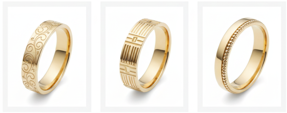 Engraving adds detail through repeating patterns, geometric lines, or decorative edges like milgrain. These designs can feel vintage-inspired or clean and modern depending on the pattern style. Patterned bands keep the ring visually interesting without relying on stones.