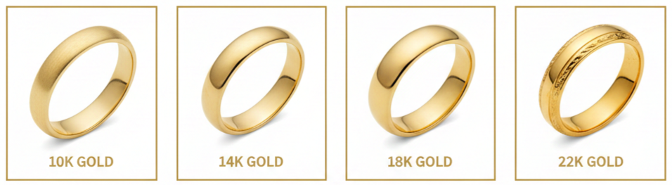 - What Karat Means: Karat measures how much pure gold is in the ring. Pure gold at 24K is usually too soft for a daily wedding band, so most rings use gold mixed with other metals. Those added metals improve durability while also influencing the final color and how the ring wears over time.