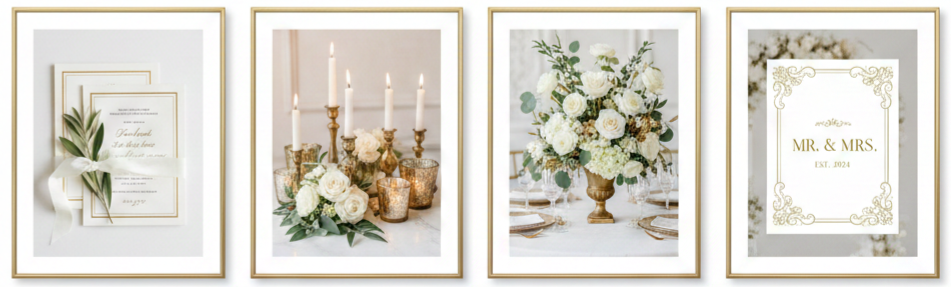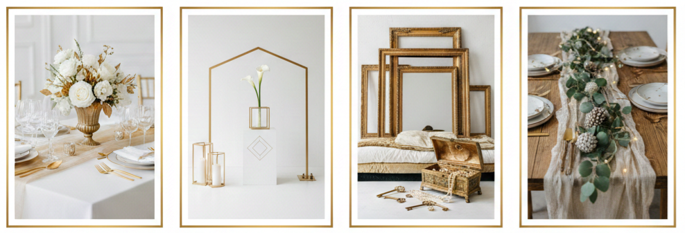| Antique Gold | Vintage-inspired frames, ornate candleholders, classic venues, memory tables | Ultra-modern décor with sharp lines |