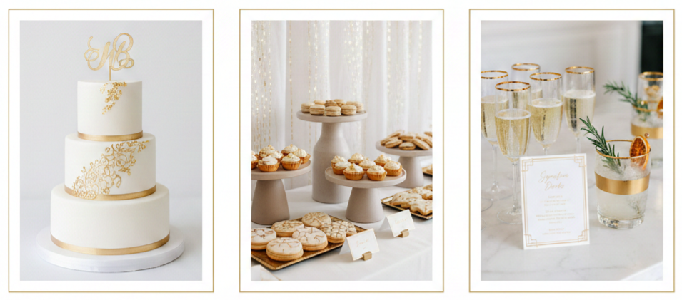 - Cake Styling: Painted gold accents look refined, minimal gold leaf adds luxury without clutter, metallic edging between tiers gives structure, and a monochrome cake with one gold topper can feel modern and elegant.