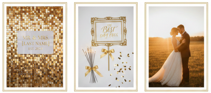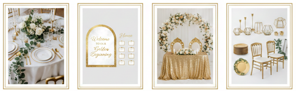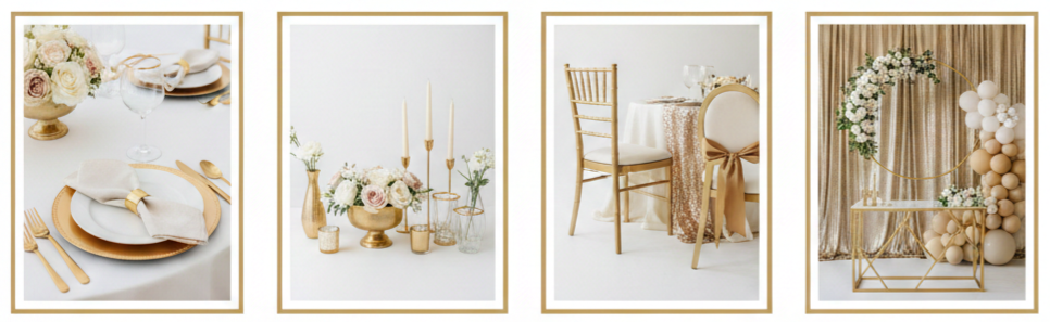 | Brushed Gold | Flatware, candleholders, chair accents, and modern signage frames | High-glare backdrops, glossy printed signs |