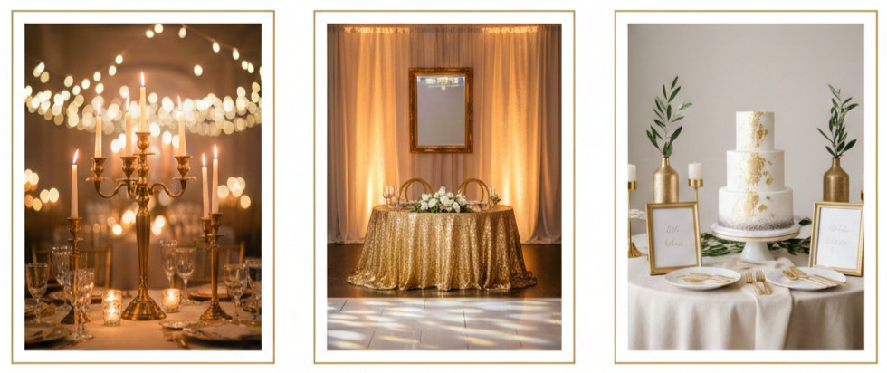 | Polished Gold | Chargers, statement arches, bold table accents, glam evening styling | Bright direct lighting zones that cause glare |