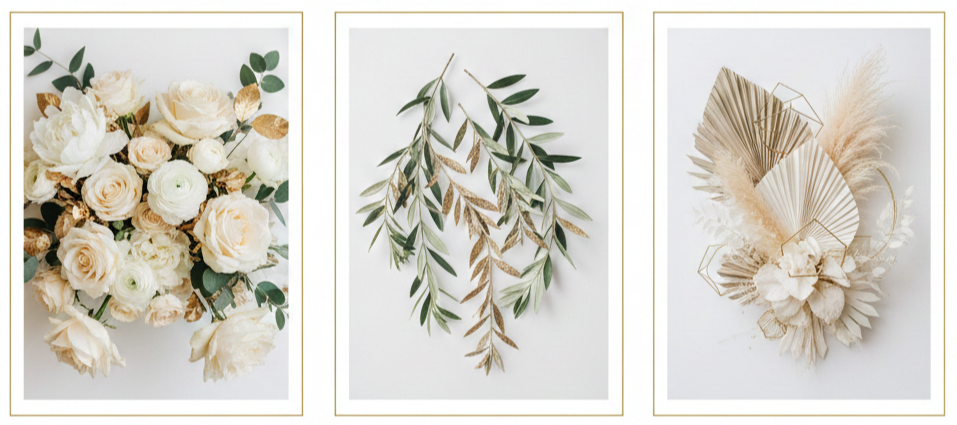 - Greenery Choices: Eucalyptus adds airy structure, Italian ruscus creates clean lines, and olive branches deliver a timeless look that pairs well with antique or champagne gold accents.