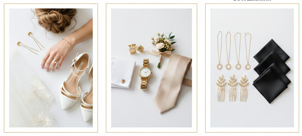 - Wedding Party Coordination: Matching bridesmaid jewelry in the same gold tone, coordinated hair accessories, and consistent pocket square styling keep the group photos looking polished and intentional.