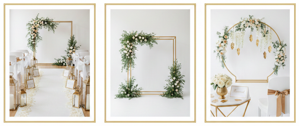 - Backdrop Ideas: A gold geometric arch with asymmetrical florals feels modern, a gold frame altar with greenery feels classic, a curved gold stand with hanging florals feels contemporary, and a minimal draped backdrop with gold tiebacks feels soft and formal