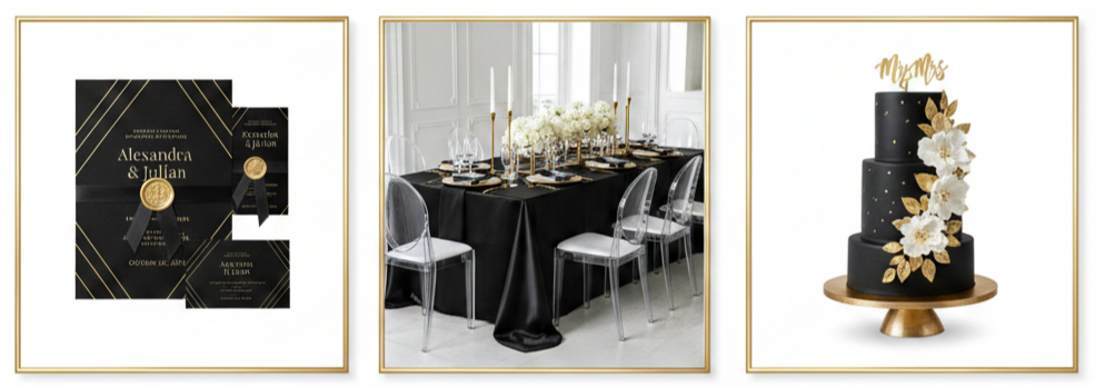 Black, white, and gold with polished accents used in controlled spots, clean typography, geometric décor, and sleek tablescapes for a bold, upscale look.