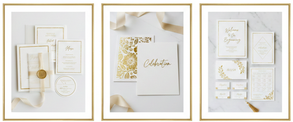 - Premium Print Options: Foil stamping adds a clean shine, embossing or debossing adds texture that feels upscale, and letterpress creates a crisp impression that looks polished when paired with minimal gold design.