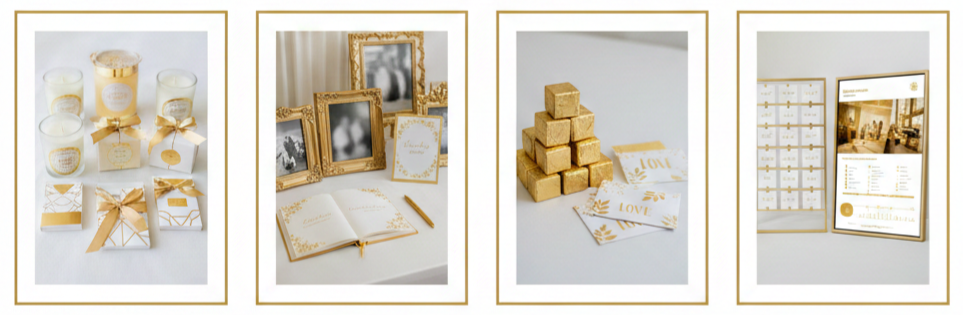 - Favor Ideas: Mini candles in neutral packaging with gold labels, chocolate boxes with gold foil, custom matchboxes designed to match stationery, and small photo keepsakes in gold-accent sleeves fit naturally into the theme.