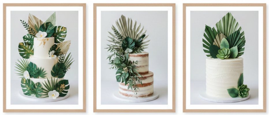 Greenery looks fresh in bright beach light and adds a modern touch. Palm-inspired sugar shapes or safe decorative greenery accents can create a bold look without needing fragile structures.