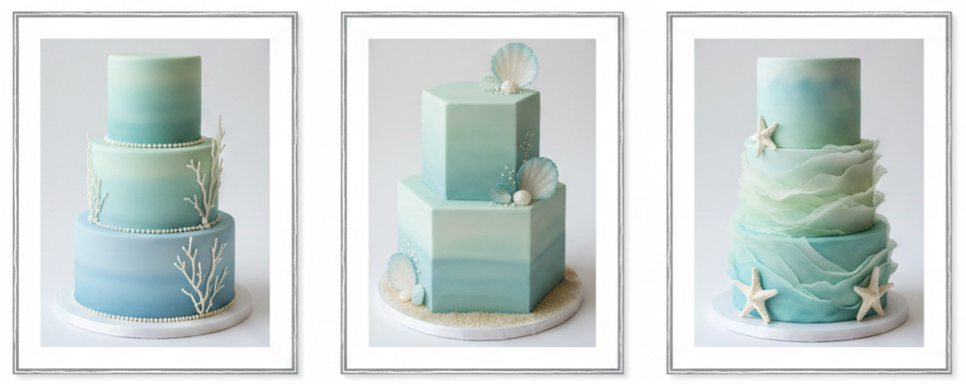 Shell details look elevated most when used sparingly. Small sugar shells at the base, delicate pearl accents, or a single shell motif per tier can create a beach feel without turning the cake into a novelty.