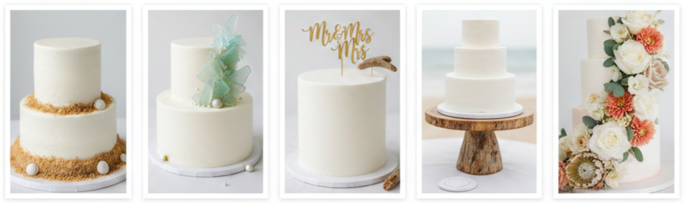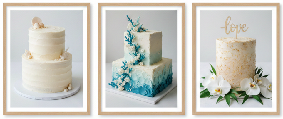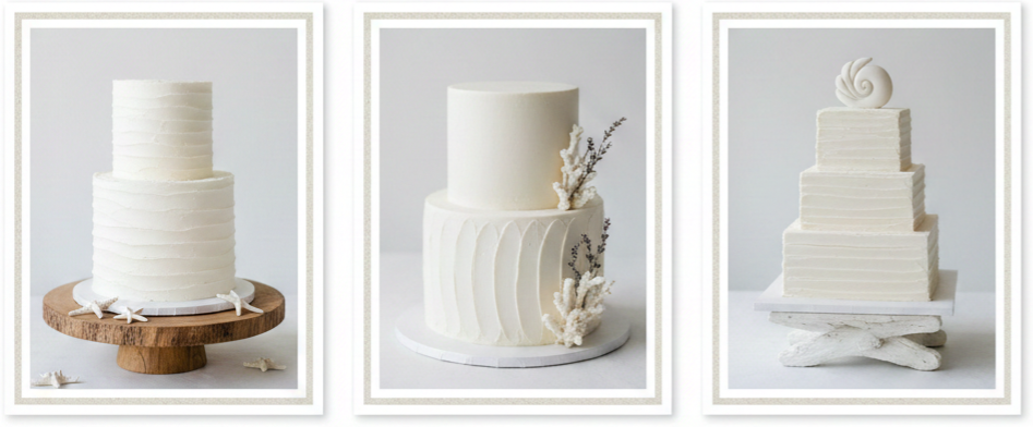 Buttercream fits beach weddings beautifully when the design stays practical and the cake does not sit out too long. We lean into simple layouts, skip heavy piping, and choose textured finishes that still look elegant even when warmth softens the surface slightly. A chilled hold until close to display time makes buttercream far more reliable outdoors.