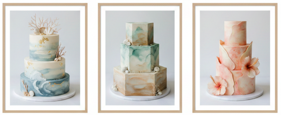 A beach setting naturally matches organic finishes, and texture also hides small weather changes better than ultra-smooth frosting. Palette-knife waves, soft stucco textures, gentle ripples, and horizontal lines photograph beautifully and stay forgiving if the surface changes slightly during the event.