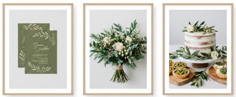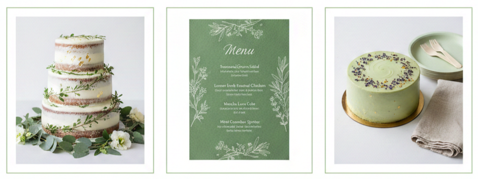 - Cake ideas: Go for white or green icing with touches of greenery or gold leaf. Naked cakes wrapped in vines or decorated with herbs look fresh and modern.