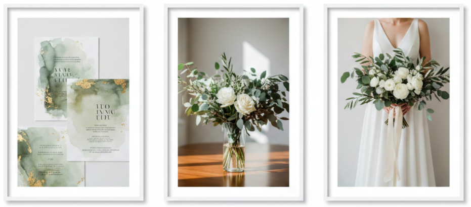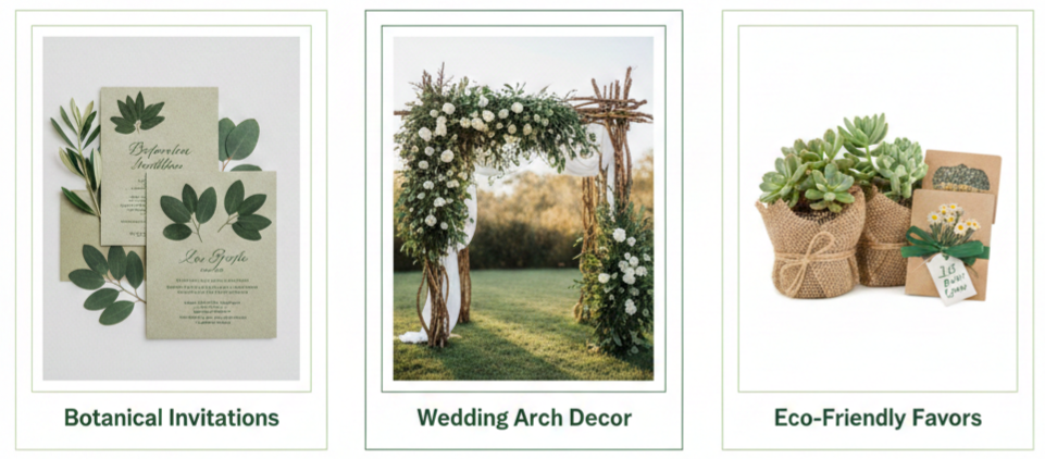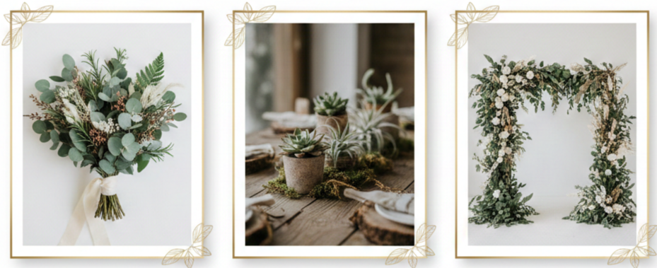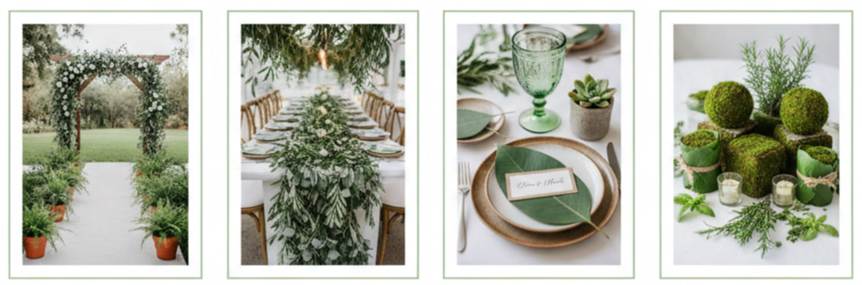 - Reception touches: Hang garlands overhead or across tables. Use moss-covered elements, fresh herbs, or leaf-wrapped candles to bring everything together.