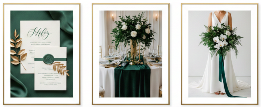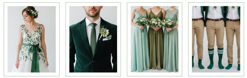 - Grooms: A dark green suit or velvet blazer looks bold and stylish. If you prefer subtle, a green tie or pocket square does the trick.