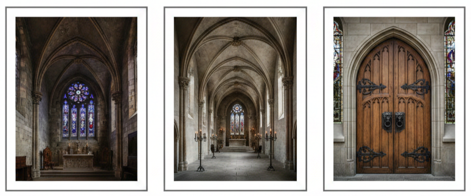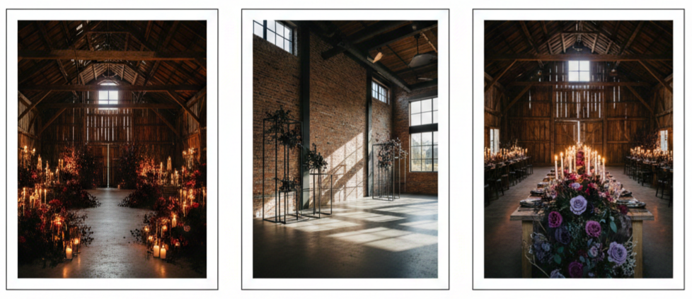 | Gothic Chapel | Romantic, Formal | Arches, stained glass, candlelit |