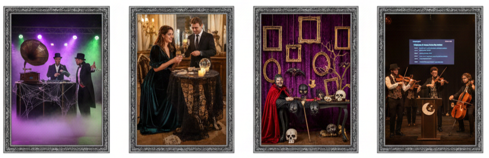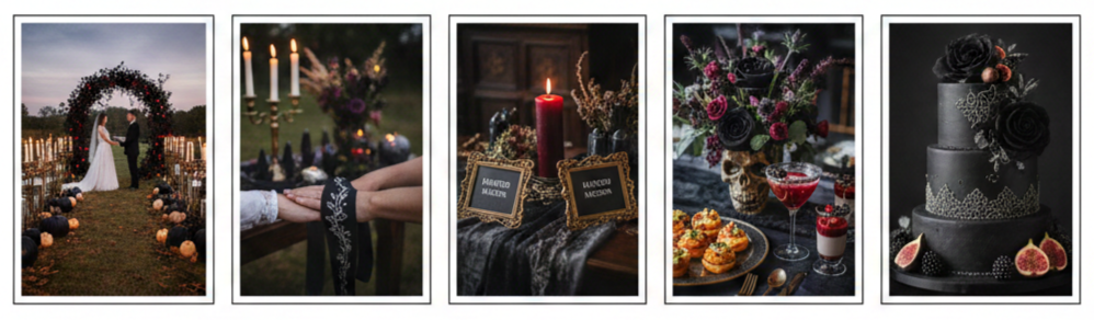 - Music Mood: A playlist can blend spooky classics with romantic tracks and dance-floor staples. Live musicians in dark formalwear or themed styling can enhance the mood without stealing attention.