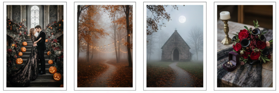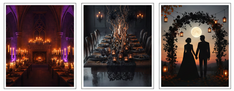 - Stay Cohesive: A Halloween wedding looks best when we choose one strong approach and repeat it. Gothic romance, enchanted forest, or vintage masquerade each has a clear look, so décor decisions become easier.