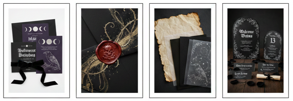 - Design Details: Gothic fonts, dark botanicals, celestial motifs, ravens, or vintage illustrations all work well. Wax seals, metallic ink, and textured envelopes make everything feel more elevated.
