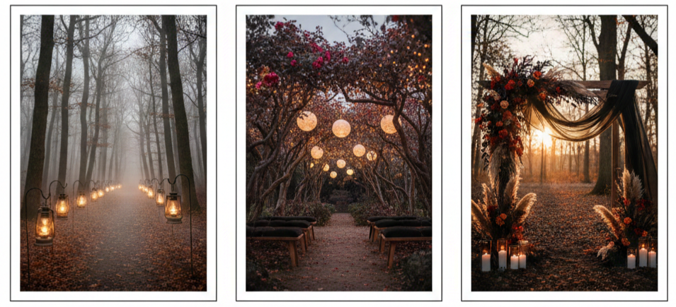 Wooded ceremony areas feel mystical in autumn, especially at dusk. A simple aisle with lanterns and warm lighting can feel enchanted without going extreme.
