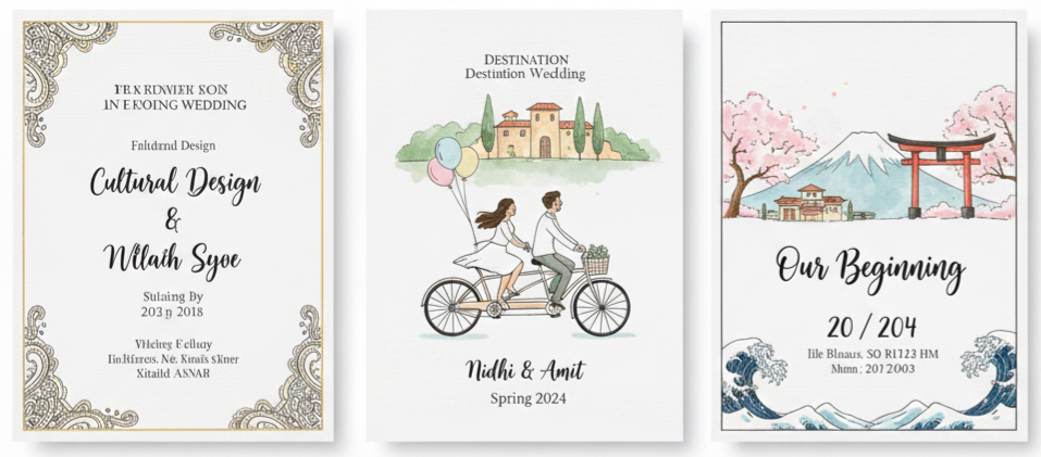 Destination weddings or multicultural celebrations come alive with traditional motifs, architecture, or regional scenery drawn into the layout.