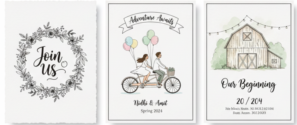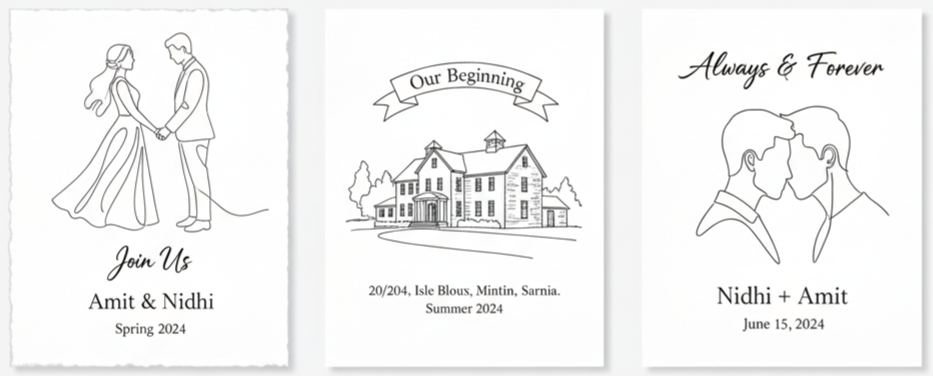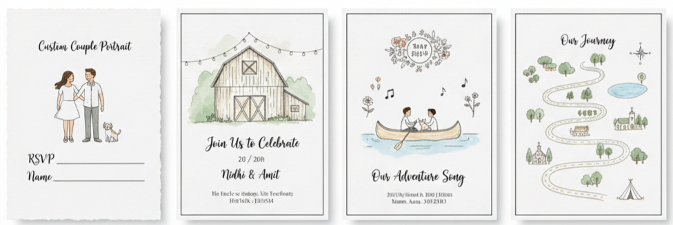 - Custom couple portraits: A hand drawn version of you and your partner—whether formal, playful, or stylized—makes the invite instantly recognizable and memorable.