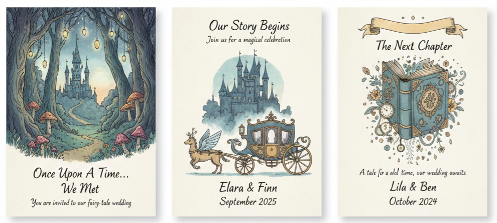 - Pros: These invitations are completely unique. No one else will have the same artwork, and they reflect your love story in a personal way. Guests will notice the care and detail, and you’ll have a gorgeous keepsake to frame or include in your wedding album. They also tie in beautifully with your overall theme.