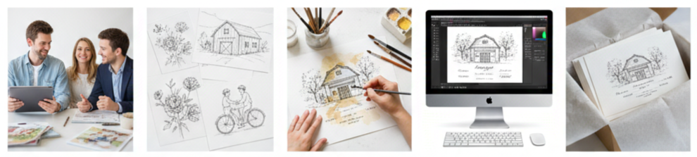 - Digital layout and text: After finishing the illustration, the artist scans the artwork and integrates your wedding information using custom typography or digital fonts.