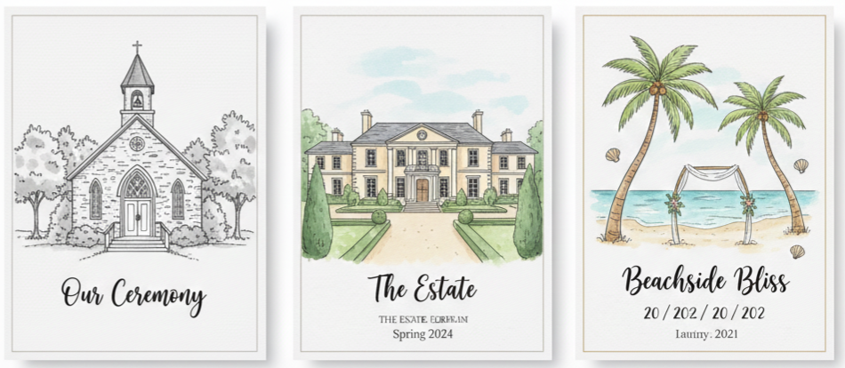 Many couples ask for a hand drawn sketch of their ceremony or reception venue. Whether it’s a chapel, estate, or beachside view, these illustrations add a personal touch guests will recognize instantly.