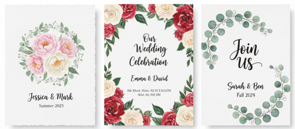 Watercolor blooms like peonies, roses, or eucalyptus are always a hit. They match well with nature-themed or outdoor weddings and tie beautifully into bouquets or decor.