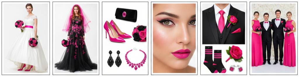 - Bridal Party Styling: Mix hot pink and black across bridesmaids and groomsmen for strong contrast, or keep outfits consistent and use flowers and accessories to create variation without visual clutter.