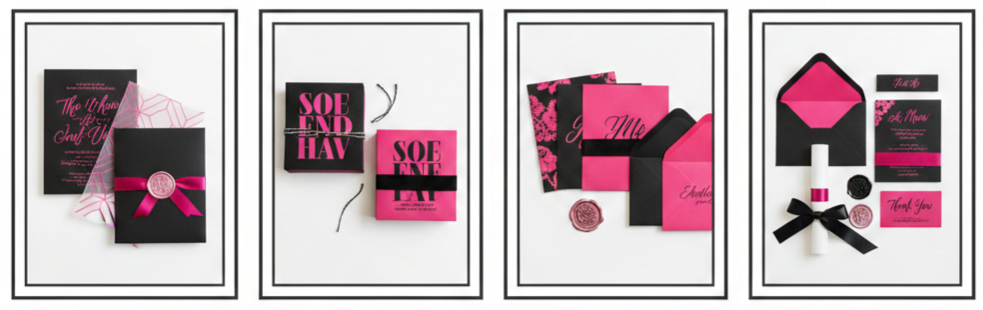 - Envelope Details: Use black envelopes with hot pink liners, or hot pink envelopes with black addressing to keep the palette consistent from the moment guests pick up the mail.