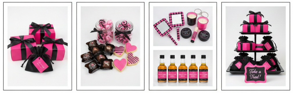 - Mini Bottle Concepts: Create mini liquor bottle favors with custom pink-and-black labels for a polished look that feels more “event” than generic.