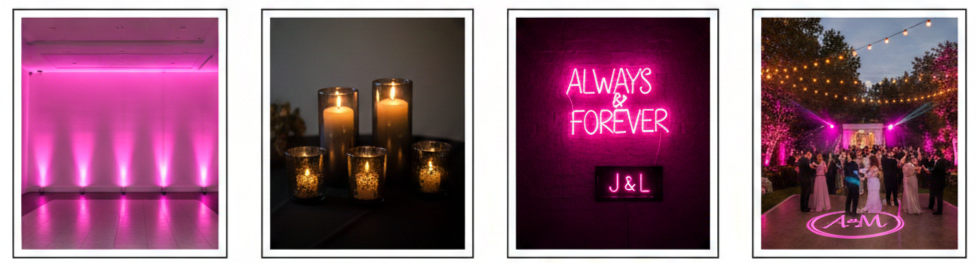 - Outdoor Glow Options: For outdoor receptions, combine warm string lights with pink accent lighting so the space stays romantic while the theme still shows through.