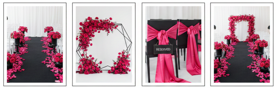 - Aisle Styling: Use a black aisle runner with hot pink petals along the edges, or add small floral markers that alternate between pink-heavy and greenery-heavy arrangements to create rhythm.