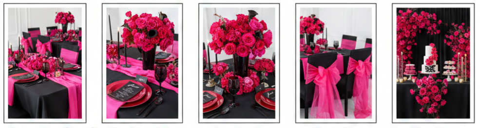 - Table Foundations: Use black linens as your base, then bring in hot pink through runners, napkins, menus, or chargers so the contrast stays bold and clean.