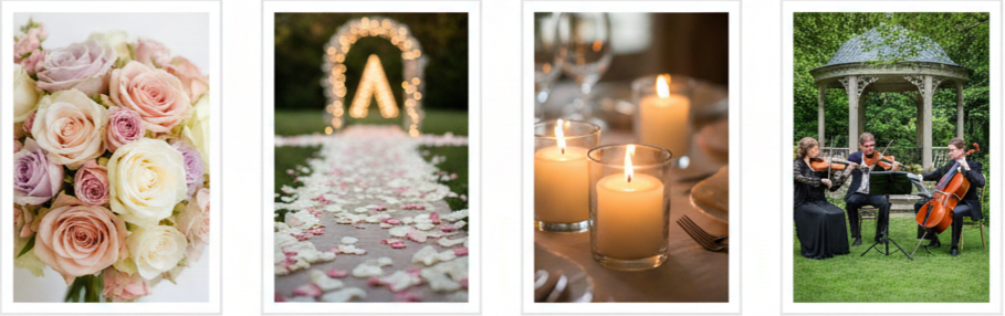 | Classic Romantic | Garden, mansion | Candles, roses, soft colors | Elegant and timeless |