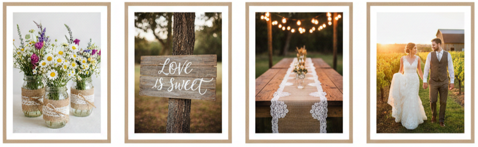Laid-back charm with mason jars, wooden signs, burlap runners, and twinkle lights. This style shines in a barn, open field, or vineyard, and pairs well with wildflowers and lace.