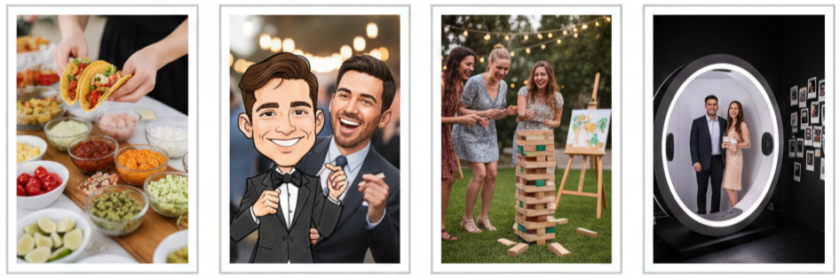 Use fun add-ons like trivia cards at tables, a Polaroid guestbook, or outdoor lawn games to keep guests occupied and happy.