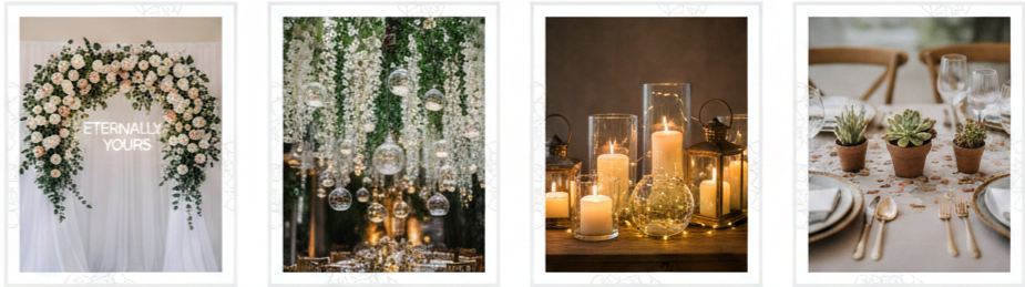 The right décor turns a simple space into something magical. Whether you’re in a ballroom or backyard, small details can have a big impact.