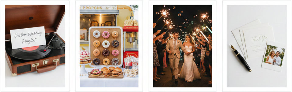 - Modern photo options: Instead of a standard booth, try a 360-degree video booth or a Polaroid guest wall where everyone leaves a picture and note.