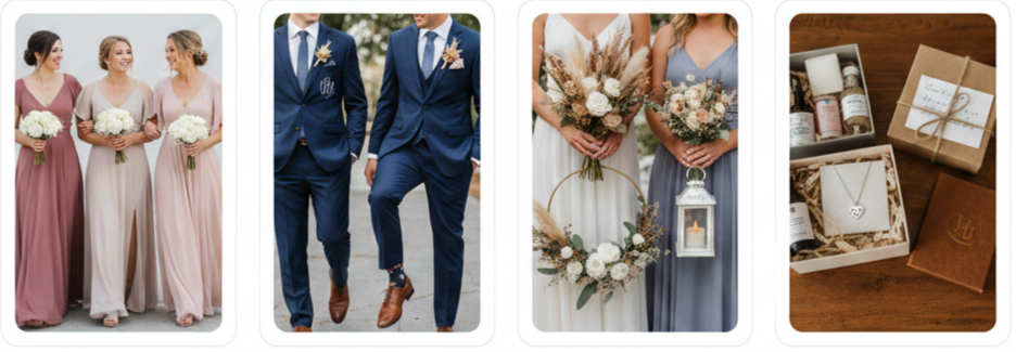 Your bridal party helps tell the visual story of your day. Let their looks reflect your theme and make each person feel confident and comfortable.