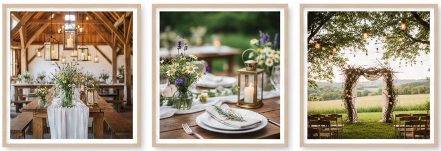 Think cozy barns, wooden tables, hanging lanterns, and wildflower arrangements. This style is perfect for outdoor or countryside settings where the natural surroundings already bring warmth to your event.