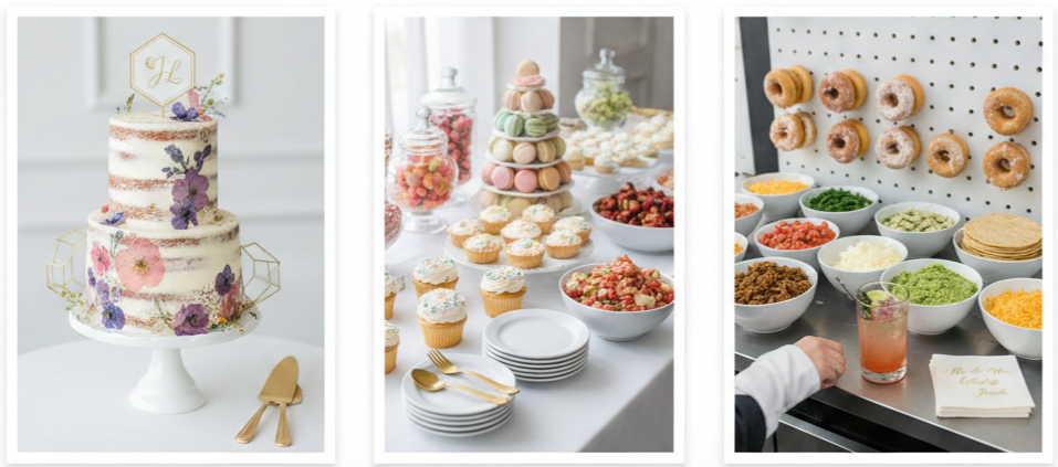 - Beyond the Cake: Couples are turning to dessert tables that include cupcakes, tarts, macarons, donuts, and even candy stations. These displays offer variety and let guests serve themselves throughout the evening.