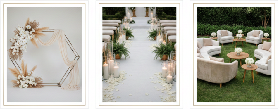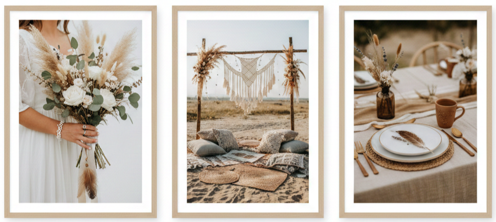 Embrace relaxed vibes with earthy tones, layered rugs, feather accents, and macramé details. This style works great for couples who love artistic freedom and nature-filled backdrops.