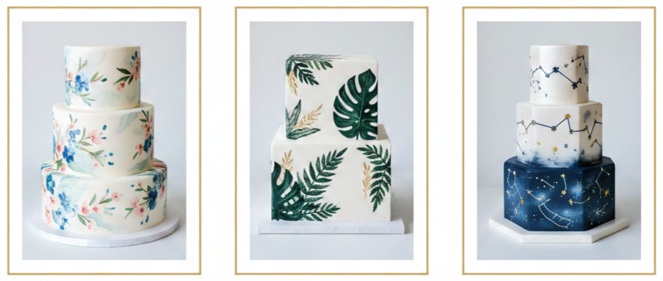 Cakes decorated with watercolor florals, botanical elements, or custom illustrations give a soft, romantic feel.