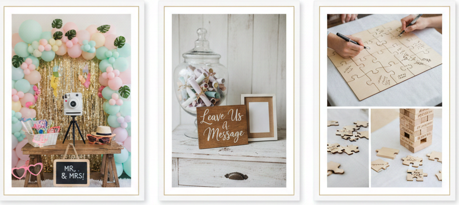 - Guest Book Ideas: Polaroid scrapbooks, signed Jenga blocks, puzzle pieces, message-in-a-bottle notes, or thumbprint artwork add fun twists to traditional guest books.