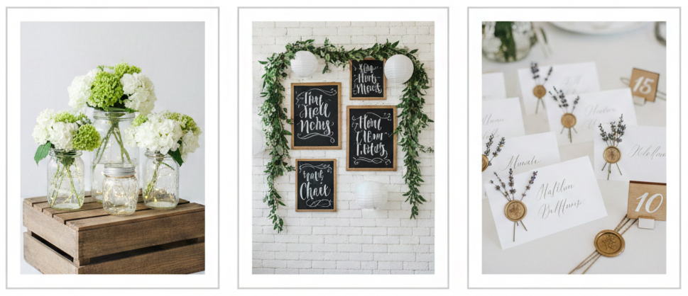 Repurposed jars, thrifted décor items, handmade signs, paper crafts, photo displays, and edible favors are affordable options that still look amazing.