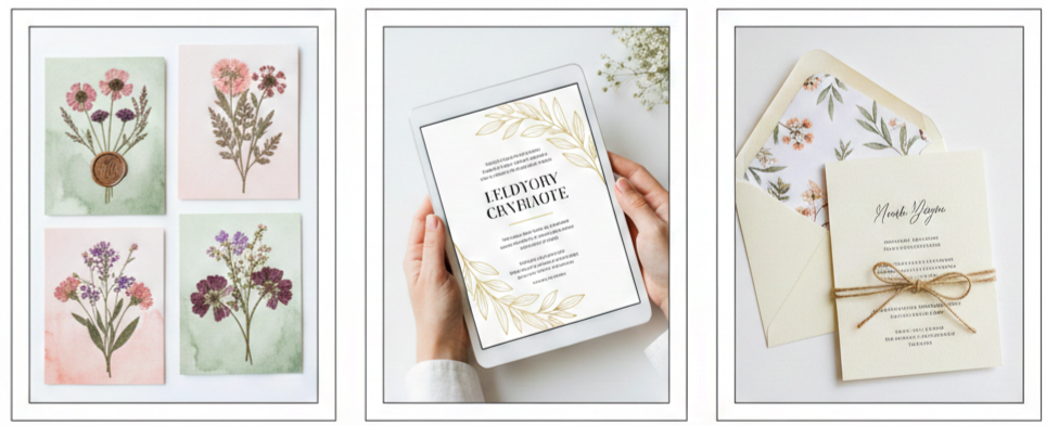 - Handcrafted Elements: Watercolor backgrounds, pressed flowers, hand-stamped accents, envelope liners, or hand-tied twine bring warmth and uniqueness to every invitation.