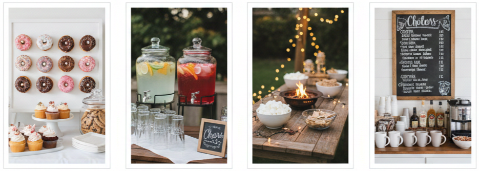 - Drink Stations: Cocktail bars, mocktail setups, lemonade stands, coffee bars, or hot chocolate stations offer variety and fun.